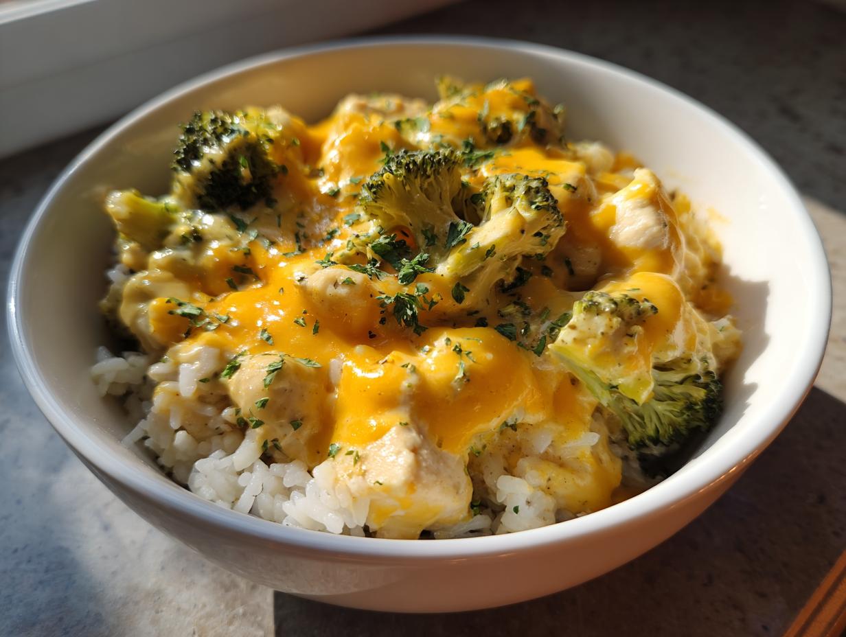 Amazing Cheesy Broccoli Chicken Rice Comfort Bowl
